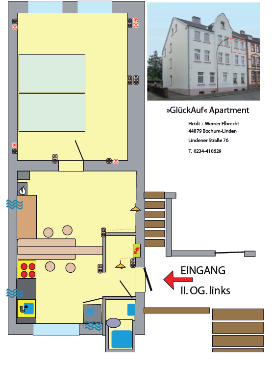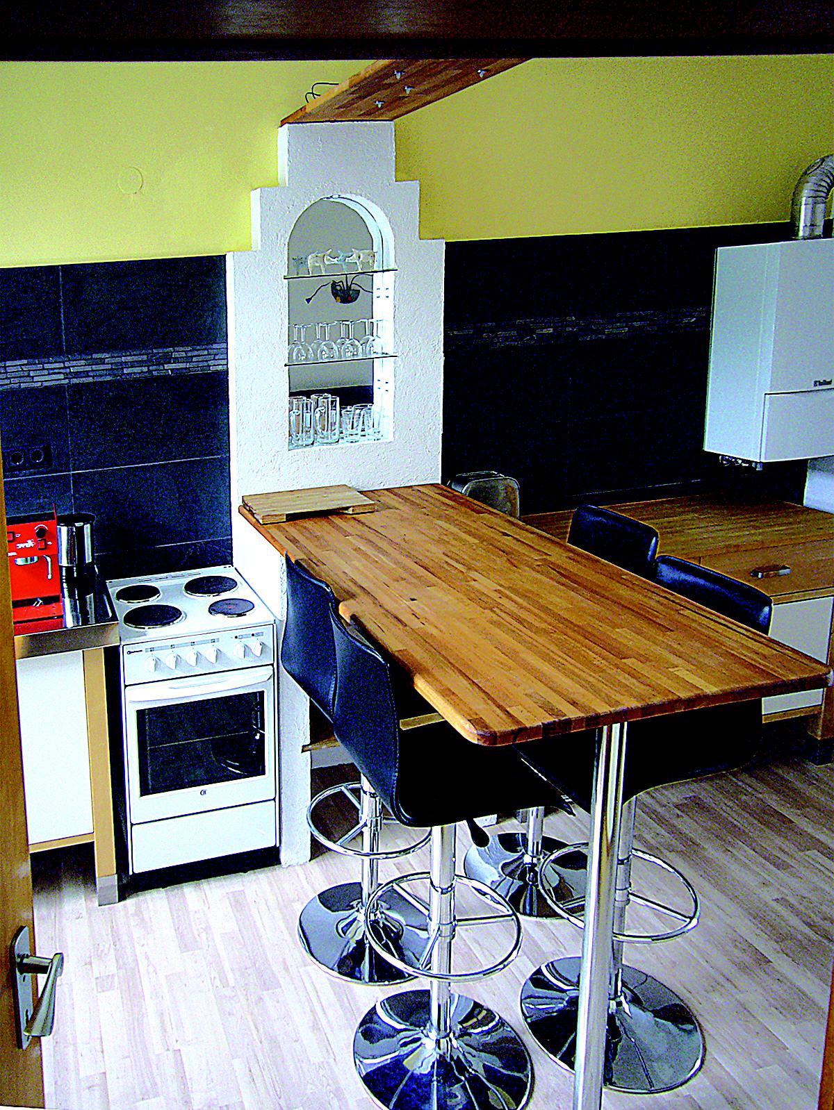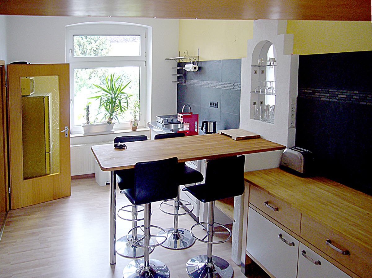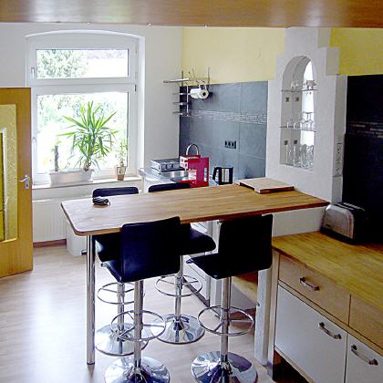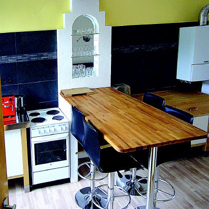 Das Apartment (Nur für Nichtraucher) befindet sich im II. OG eines renovierten und modernisierten Ziegelbaus von 1910. Nach einem kleinen Flur mit Garderobe geht es zu Dusche/WC links, oder durch eine Glastür in den großen Küchen-/Barbereich. Ausgestattet mit Kühlschrank, Herd, Spüle, Cafémaschine und Küchenutensilien. Einkaufsmöglichkeit besteht direkt schräg gegenüber bei LIDL (tägl. bis 21:00 h offen). Am Tresen finden vier Personen Platz.