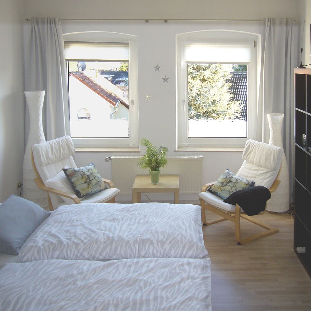 Der angrenzende Schlafraum bietet zwei Holzrahmenbetten im XXL-Format (220x100 cm), Regalwand und Longechairs und einen Internetanschluss. Fensterausblick Südost Panorama Ruhrtal, Bergbausiedlung »Friedlicher Nachbar«.
